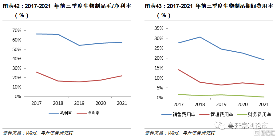 2021年生物製品板塊盈利能力顯著提升。截至2021年前三季度,生物製品板塊毛利率爲57.64%,同比提升1.12%;淨利率爲21.95%,同比提升4.55%。期間費用率爲26.34%,同比下降4.94%;其中銷售費用率爲19.2%,同比下降3.4%;管理費用率爲6.66%,同比下降0.92%;財務費用率爲0.48%,同比下降0.61%。毛利率和淨利率均出現回升,期間費用率持續下降,行業盈利能力顯著提升。