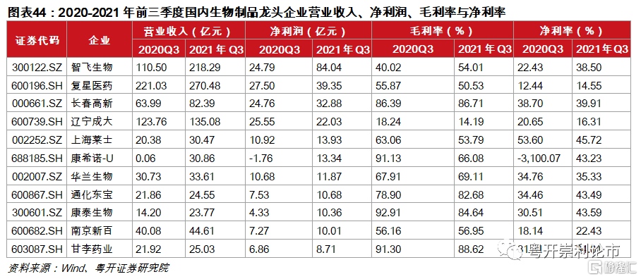 截至2021年Q3,共10家生物製品企業淨利潤突破10億元,其中智飛生物(84.04億元)、復星醫藥(39.35億元)和長春高新(32.88億元)位居前三位。生物製品企業盈利能力普遍較強,其中上海萊士、康希諾、通化東寶等公司2021年淨利率超40%。對於生物製品板塊,我們重點推薦兩條邏輯主線:(1)細分領域龍頭企業,如長春高新、智飛生物、康希諾、華熙生物等;(2)創新品種上市在即,未來利潤有望持續改善的企業,如復星醫藥、君實生物、沃森生物等。