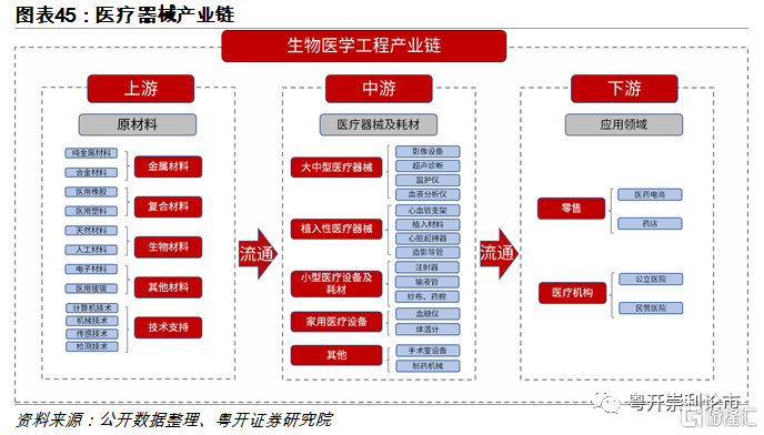 醫療器械是一個多學科交叉、知識密集、資金密集型的高技術產業,產業鏈涉及範圍廣、細分領域多。產業鏈上遊主要包括金屬材料、複合材料、生物材料、技術支持等,關聯學科衆多;產業鏈中遊可分爲醫療設備、醫療耗材和體外診斷等諸多細分領域;產業鏈下遊主要是零售和醫療機構。