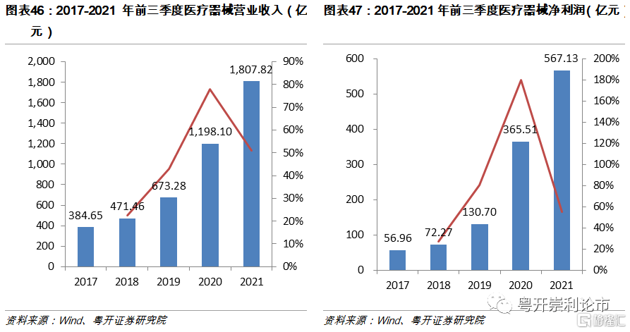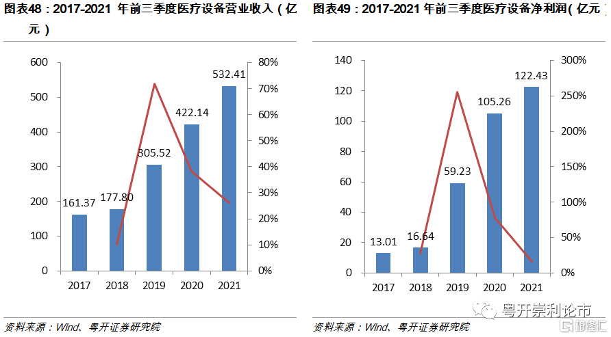 從細分子板塊的角度,醫療設備板塊2021年實現營業收入532.41億元,同比增長26.12%;實現淨利潤122.43億元,同比增長16.32%。醫療設備近年來發展不斷提速,主要得益於醫藥新基建及國產替代,特別是疫情後各地政府紛紛加速“醫療新基建”的佈局,帶來呼吸機、監護儀、超聲等醫療設備的快速放量。