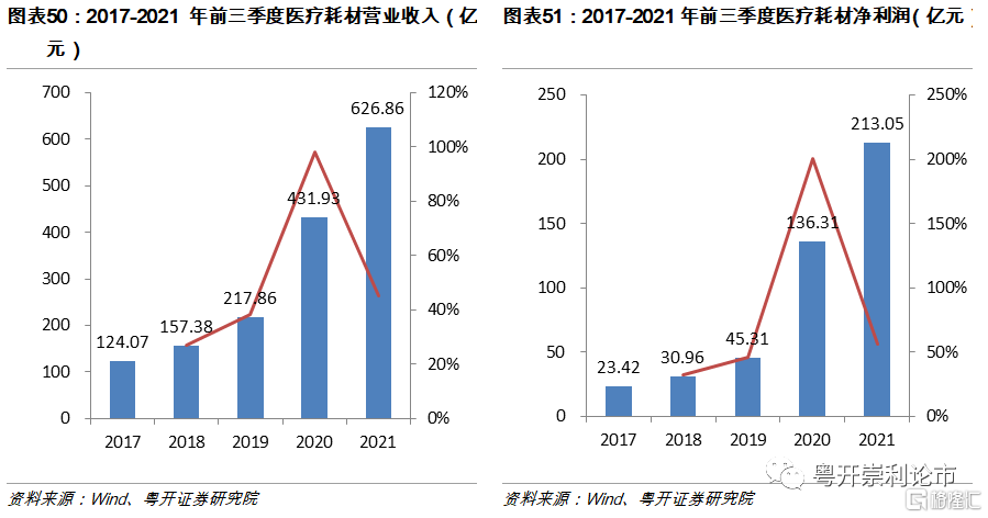 醫療耗材板塊2021年實現營業收入626.86億元,同比增長45.13%;實現淨利潤213.05億元,同比增長56.29%。醫療耗材板塊全年增速較2021年Q1明顯放緩,主要是由於下半年低基數效應逐漸消除。疊加骨科創傷及關節帶量採購實施影響,骨科耗材增速進一步下滑。