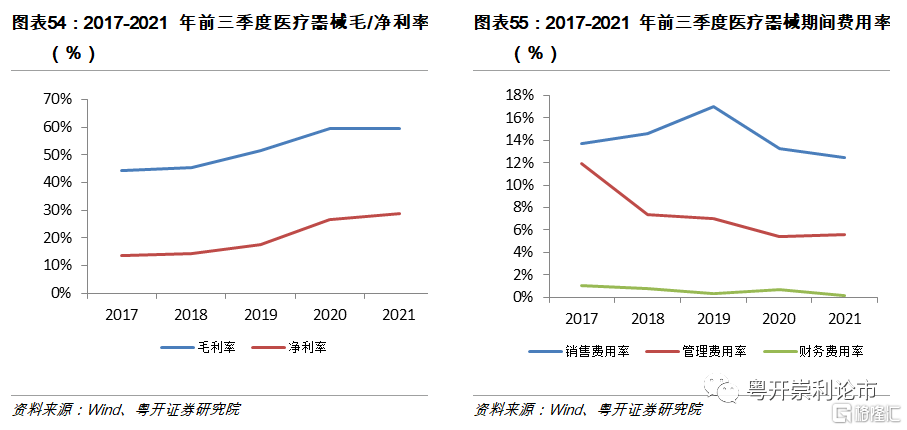 2021年醫療器械板塊盈利能力提升。2021年,醫療器械板塊毛利率爲59.50%,同比提升0.04%;淨利率爲28.69%,同比提升2.23%。期間費用率爲18.16%,同比下降1.23%;其中銷售費用率爲12.46%,同比下降0.83%;管理費用率爲5.58%,同比下降0.16%;財務費用率爲0.12%,同比下降0.56%。毛利率和淨利率均出現小幅回升,期間費用率持續下降,醫療器械行業盈利能力不斷提升。