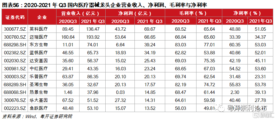 截至2021年三季度,共7家醫療器械企業淨利潤突破20億元。絕大多數醫療器械龍頭盈利能力不斷提升,2021年淨利率超50%的醫療器械企業包括英科醫療、東方生物、藍帆醫療、中紅醫療、聖湘生物等,對於生物製品板塊,我們重點推薦三條邏輯主線:(1)競爭格局良好的上遊設備、耗材企業;(2)細分賽道中創新實力強、產品差異化的特色企業,有望長期享有創新紅利;(3)佈局海外市場的下遊器械龍頭。