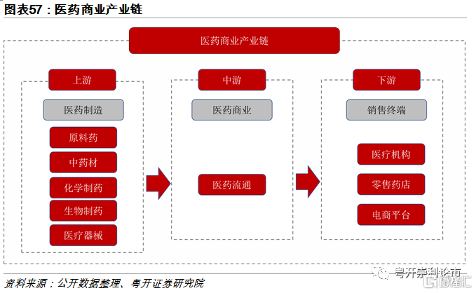 醫藥商業主要包括醫藥流通和線下藥店。從醫藥流通的產業鏈看,醫藥流通行業上遊爲醫藥製造行業,中遊醫藥流通包括醫藥批發、醫藥零售等,下遊爲銷售終端。由於醫藥不分業,醫藥商業除了中遊流通環節外,還包括零售藥店。藥品通過醫院、基層醫療機構、零售藥店等渠道最終流入到消費者手中。