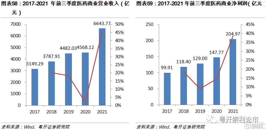 2021年醫藥商業板塊分化明顯,醫院端業務快速恢復,零售端增速回調。截至2021年三季度,醫藥商業板塊(共29家企業)實現營業收入6643.77億元,同比增長45.43%;實現歸母淨利潤204.97億元,同比增長38.71%。
