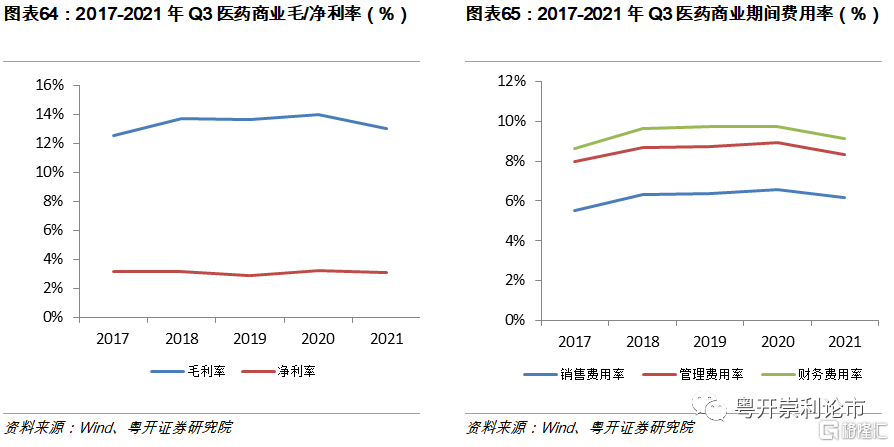 2021年醫藥商業板塊盈利能力小幅提升。2021年Q3,醫藥商業板塊毛利率爲13.06%,同比下降0.93%;淨利率爲3.09%,同比下降0.15%。期間費用率爲9.15%,同比下降0.6%;其中銷售費用率爲6.14%,同比下降0.42%;管理費用率爲2.17%,同比下降0.17%;財務費用率爲0.83%,同比下降0.02%。淨利率小幅下滑,期間費用率持續下降,醫藥商業板塊盈利能力小幅提升。