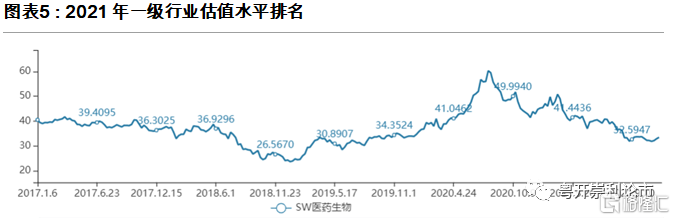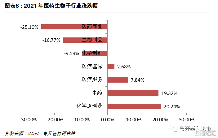 板塊高度分化,化學原料藥漲幅居前。縱觀醫藥生物板塊2021年各子行業走勢,行業受市場情緒波動較大,整體呈現高度分化態勢。其中,上漲的子行業共四個,分別是化學原料藥、中藥、醫療服務和醫療器械;下跌的子行業共三個,分別是醫藥商業、生物製品和化學制劑。具體而言,化學原料藥板塊自年初以來漲幅最大,達20.24%,核心原因在於CXO板塊的持續火熱;醫藥商業板塊跌幅居前,累計下跌25.1%,其中連鎖藥房2021年業績增速不及預期,回調明顯。