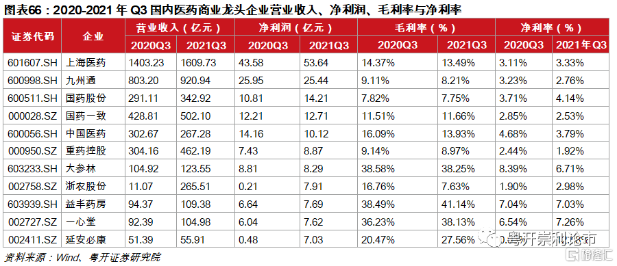 益豐藥房:益豐藥房是國內中南、華東區域領先的大型醫藥零售連鎖企業。2021年,公司門店擴張勢頭強勁,截至2021年Q3,公司門店總數達7246家,較年初淨增門店1255家。此外,公司通過智能化全渠道的服務和交易,不斷打造線上線下承接醫院處方外流、大健康商品與新零售業態創新,實現公司經營模式的全面升級。此外,隨着分級診療和處方外流的持續推進,公司有望憑藉高標準的建設門店和專業服務能力大量承接外流處方。