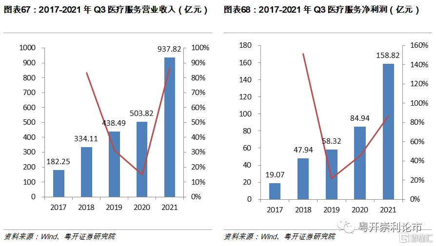 醫療服務主要包括醫療研發外包、診斷服務和醫院三個子板塊。近年來,外部受益於全球產業轉移疊加產業升級,內部受益於中國醫藥創新崛起,臨牀前和臨牀試驗數量快速增長,我國醫療研發外包板塊景氣度持續提升。連鎖醫療機構2020年受疫情影響實行歇業、延遲開業等,2021年,隨着疫情的緩和,就醫人數全面恢復,疊加醫療習慣和觀念變化催生的需求增長,醫療板塊景氣度迅速提升。