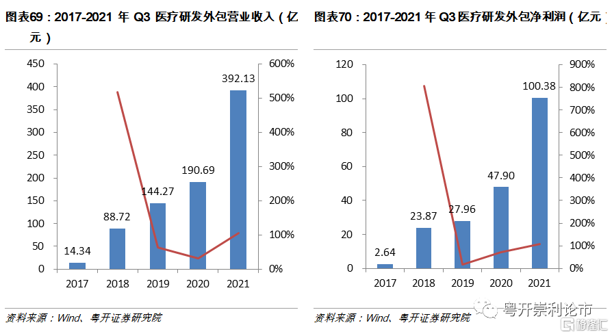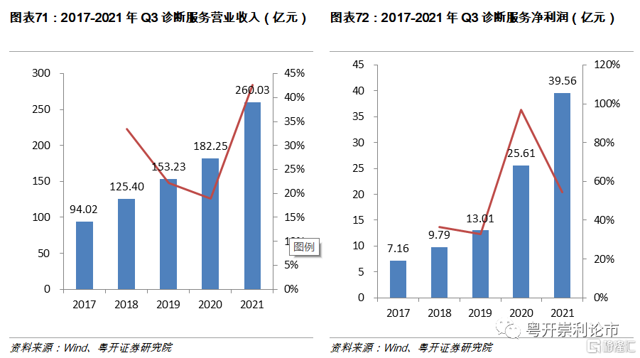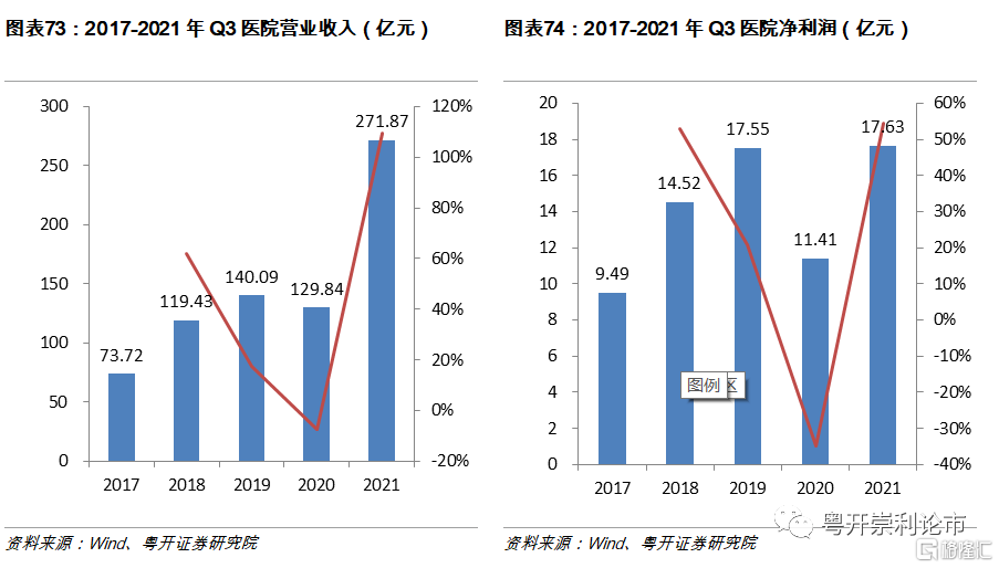 醫療研發外包板塊業績大幅增長,營業收入和淨利潤增速創近三年新高。截至2021年Q3,醫療研發外包板塊實現營業收入392.13億元,同比增長106%,實現淨利潤100.38億元,同比增長109%,高景氣度延續。診斷服務板塊實現營業收入260.03億元,同比增長43%,實現淨利潤39.56億元,同比增長54%,診斷服務板塊淨利潤增速出現回調,源於疫情的穩定造成診斷業務量的逐步下滑,未來腫瘤檢驗或成爲新的增長點。醫院就醫人數自2020年下半年逐步恢復,企業業績出現明顯回升,板塊實現營業收入271.87億元,同比增長109%,實現淨利潤17.63億元,同比增長54.46%。