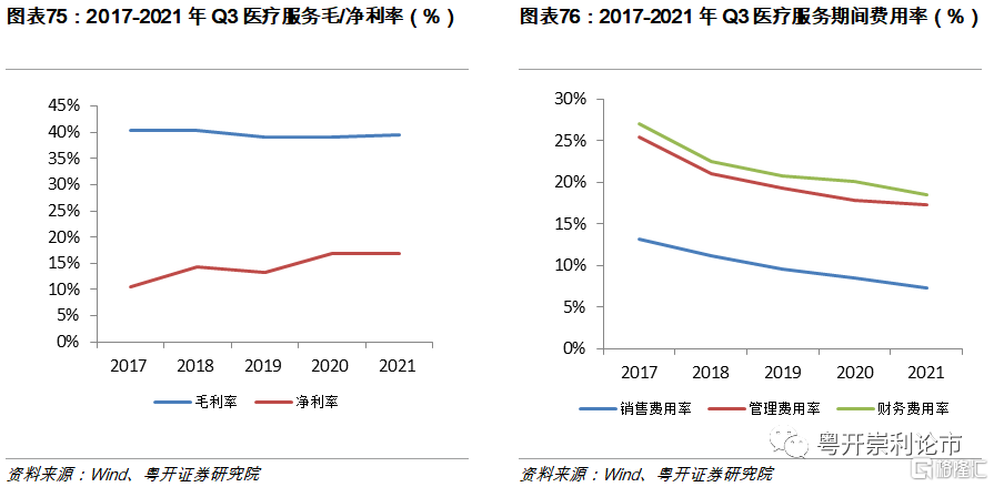 2021年Q3醫療服務板塊盈利能力整體增強。2021年Q3,醫療服務板塊毛利率爲39.43%,同比增長0.34%;淨利率爲16.94%,同比提升0.07%。期間費用率爲20.35%,同比下降3.95%;其中銷售費用率爲7.35%,同比下降1.18%;管理費用率爲10.02%,同比提升0.65%;財務費用率爲1.19%,同比下降1.09%。醫療服務板塊毛利率和淨利率小幅回升,期間費用率明顯下降,板塊盈利能力整體增強。
