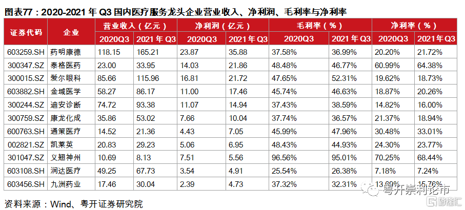 截至2021年Q3,共6家醫療服務企業淨利潤突破10億元,其中藥明康德(35.88億元)、泰格醫藥(21.86億元)和愛爾眼科(21.72億元)位居前三位。未來,隨着臨牀前與臨牀試驗數量的提升與檢驗檢測服務的放量,強者恆強趨勢有望延續。對於醫療服務板塊,我們重點推薦兩條邏輯主線:(1)訂單量持續提升、業務不斷拓展的CRO企業,如藥明康德、康龍化成、凱萊英等;(2)盈利能力持續改善、診療網絡不斷提升的醫院龍頭企業,如愛爾眼科、通策醫療等