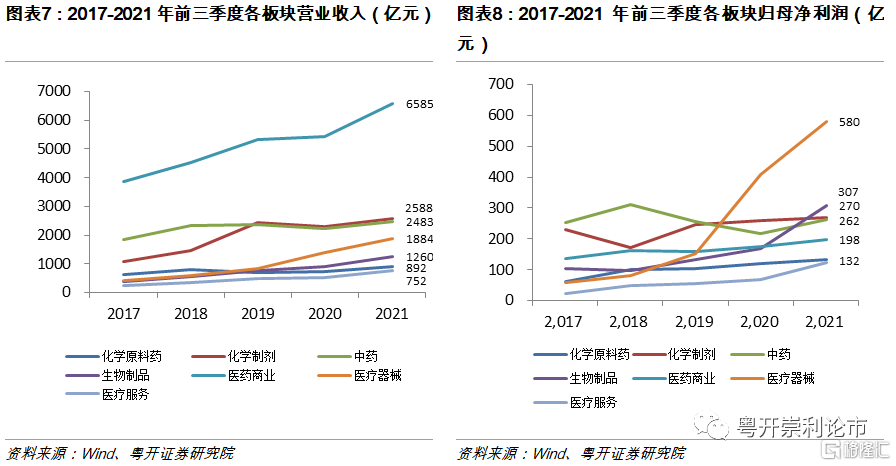 醫藥商業板塊蟬聯營收桂冠,醫療器械板塊淨利潤增速顯著。得益於2020年醫藥生物板塊的低基數,2021年各子板塊營業收入和淨利潤同比均出現顯著提升。其中,醫藥商業板塊實現營業收入6585億元,同比增長20.96%,蟬聯子行業營業收入桂冠。醫療器械板塊實現淨利潤580億元,同比增長41.99%。值得注意的是,生物製品板塊實現淨利潤307億元,同比增長81.34%,主要得益於新冠疫苗和激素類的快速放量。