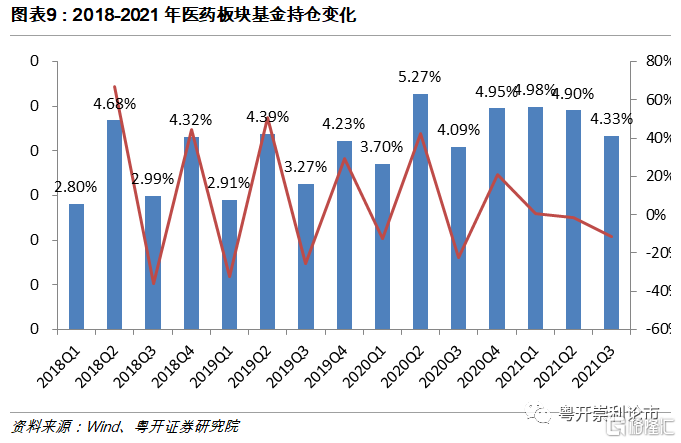 2021年基金醫藥股持倉比重創歷史新高,但隨着疫情的平穩持倉比重呈現下滑趨勢。隨着2021年漸入尾聲,各大機構在持倉、減倉的板塊配比上,表現出一定的分化。2020年,受新冠疫情的影響,防禦屬性較強的醫藥板塊成爲了機構重點佈局的方向之一,其中2020年Q4基金醫藥股的持倉比重達4.95%。這一較高的持倉比重延續至2021年,其中2021年Q1和Q2基金醫藥股的持倉比重分別達4.98%和4.90%。但伴隨着疫情進入下半場,醫藥板塊的賺錢效應下滑,Q3基金醫藥股的持倉比重下滑至4.33%,同比減少11.7%。