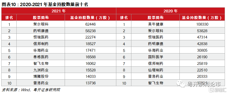 從持股數量來看,2021年基金持股數量最多的前十個股分別是:愛爾眼科、藥明康德、恆瑞醫藥、信邦製藥、華海藥業、泰格醫藥、智飛生物、九州藥業、博騰股份、普洛藥業。與2020年相比,2021年基金重倉新增泰格醫藥、九洲藥業和博騰股份,這三支股票均屬於醫療服務下的研發外包板塊(CXO),反映出基金2021年對醫療服務板塊高景氣度的追逐
