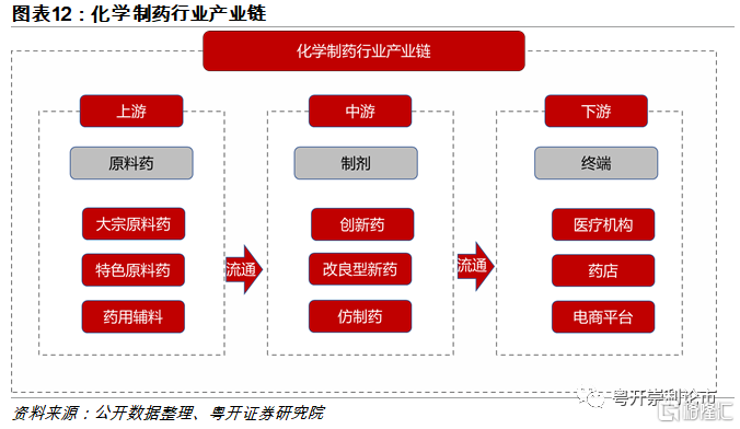 化學制藥主要包括化學原料藥和化學藥製劑。從產業鏈的角度分析,化學制藥上遊是原料藥供應商,主要包括大宗原料藥、特色原料藥和藥用輔料;產業鏈中遊是化學藥製劑,將原料藥進一步加工成爲製劑,主要涉及創新藥、改良型新藥和仿製藥的生產;產業鏈下遊是銷售終端,藥物製劑經流通運輸至醫療機構、藥店及電商平臺,最終銷售給消費者。