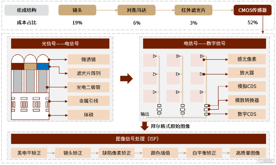 CIS(Cmos Image Sensor)是攝像頭模組的核心元器件,在攝像頭模組中的成本佔比達到52%。攝像頭模組一般由鏡片、對焦馬達、紅外濾光片、基座、圖像傳感器、PCB/FPC等零部件組成,其中鏡頭,CIS,算法是影響成像的最核心要素。