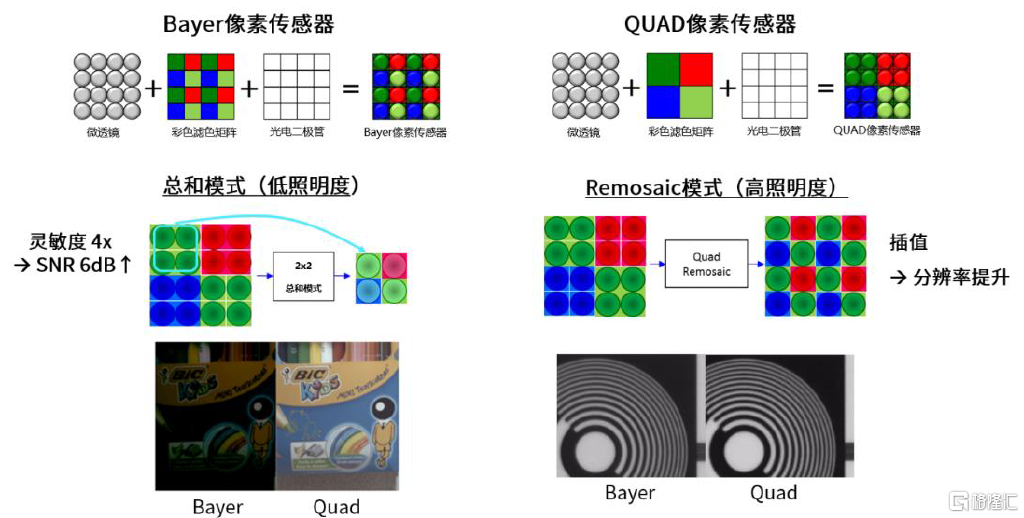 發展趨勢#2:像素四合一排列改善暗光。2016年索尼推出了四合一Quad Bayer像素技術,三星2020年推出的一億像素傳感器ISOCELL Bright HM1中採用了Nonacell像素九合一技術,豪威也在2019年推出的OV32A產品中開始使用4-Cell像素四合一的彩色濾光設計。我們認爲實現超高像素除了需要四合一像素排列以外,ISP算法能力也至關重要,頭部廠商更具優勢。