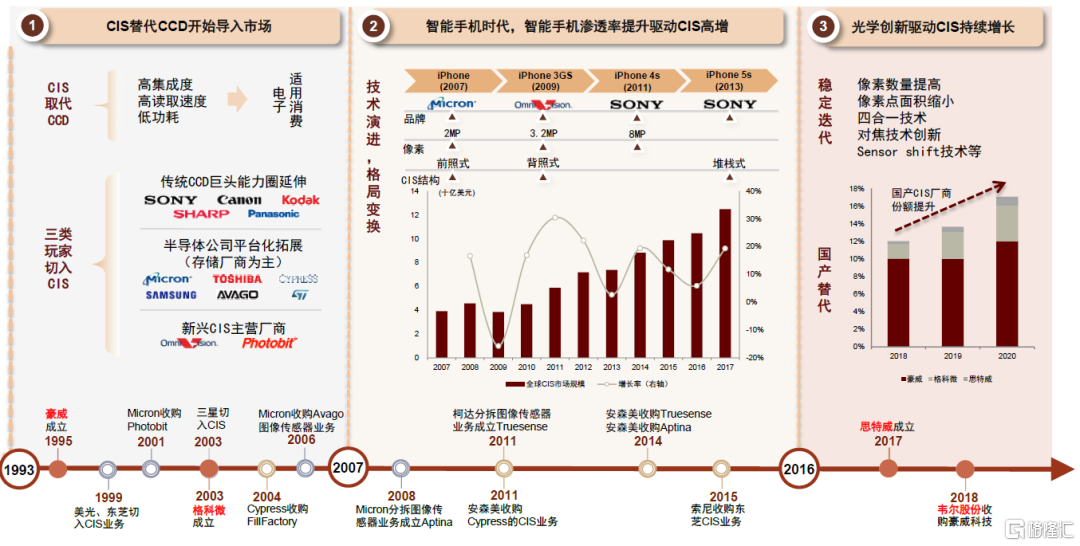 導入期,CIS快速替代CCD(1993年-2005年):三類玩家切入CIS領域:1)傳統CCD巨頭的能力圈延伸,如索尼、佳能;2)半導體公司的平臺化拓展,包括美光、東芝等;3)以豪威爲代表的新興CIS廠商。快速成長期,CIS隨着智能手機滲透率提升實現快速增長,索尼引領技術迭代(2006年-2017年):1)智能手機滲透率快速提升驅動手機CIS需求的提升,技術迭代快速,索尼在設計、工藝上引領行業技術發展。2)併購是份額提升的另一重要手段,安森美通過三次併購確立頭部廠商地位,索尼通過收購東芝CIS業務強化龍頭地位。持續增長期,行業格局趨於穩定,集中度提升(2018年-至今):1)需求端,手機出貨量增長乏力,市場增長的主要驅動力轉變爲光學升級。2)供給端,下遊對成本的考量提升,規模效應顯著;既有技術路徑方向明確,行業格局趨於穩定且向龍頭集中。