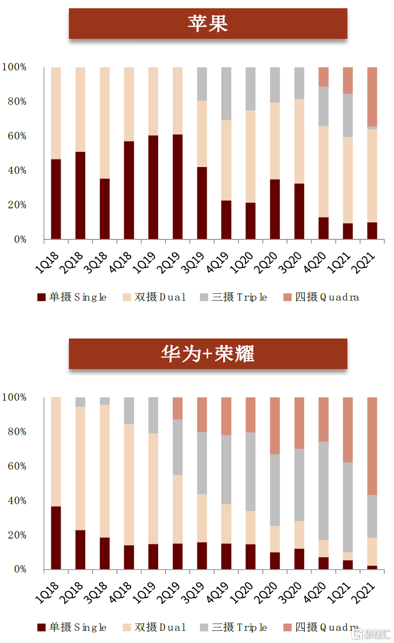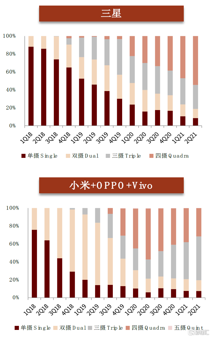 從“量”來看,短期內廠商三攝/四攝方案出現一定分化,單機搭載顆數保持提升。我們觀察到:1)小米、OPPO、Vivo等國產安卓品牌部分機型出現降規(四攝降三攝)趨勢,但三攝及以上方案總體滲透率仍不斷提升。我們認爲主要是由於第四顆攝像頭功能定位不清晰,因此國產安卓廠商追求性價比減少攝像頭數量的堆疊,可能的替代方案是升級主攝的像素規格。2)蘋果、三星、華爲、榮耀等廠商積極推動四攝方案,我們認爲主要是由於其定位高端,追求最高配置和成像效果。例如2021年1月三星的Galaxy S21 Ultra旗艦機型就採用了後置四攝的設計,主攝達到一億像素規格,並配備兩顆1000萬像素的長焦鏡頭和一顆1200萬像素的超廣角鏡頭。3)總體數量保持提升。根據IDC數據,3Q20至2Q21,全球智能手機單機搭載鏡頭顆數從3.43顆逐季度提升至3.6顆,保持穩定上升態勢。