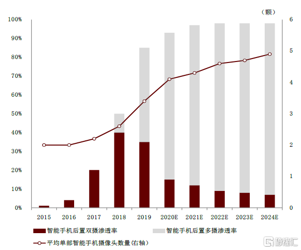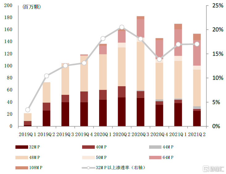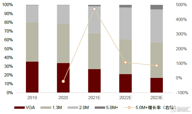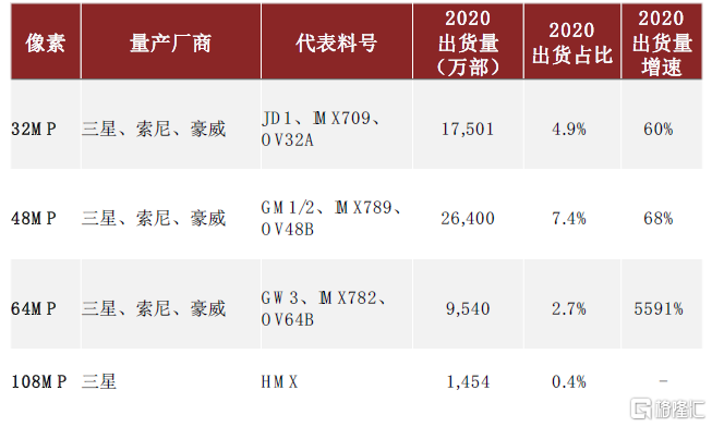 注:出貨量及滲透率按照蘋果、三星、華爲、小米、OPPO、Vivo六大品牌廠商數據統計。2020年Q4高像素滲透率波動較大主要原因爲蘋果手機(主要採用12MP鏡頭)出貨量大幅增長,而安卓系高像素鏡頭滲透率仍保持穩定。