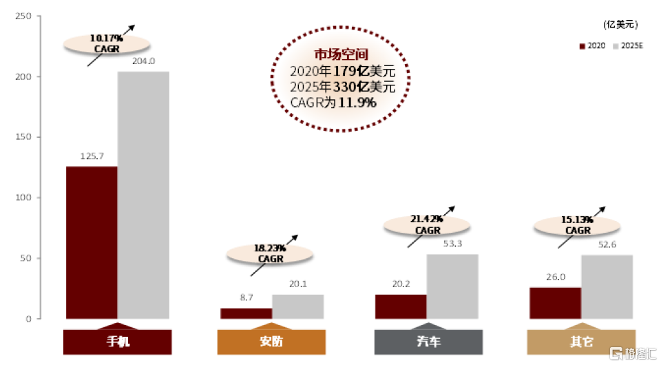 CIS(CMOS  Image Sensor)是攝像頭模組的核心元器件,在攝像頭模組中的成本佔比達到52%,是影響成像的最核心要素之一,受益於手機光學創新、自動駕駛滲透率提升、安防和ARVR市場高增長,我們預計2021-2025將以11.9%的CAGR增長至330億美元。