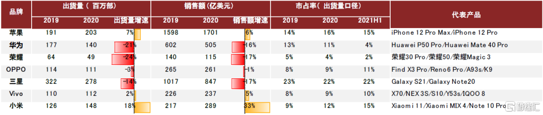 圖表18:七大手機品牌2019-2020出貨量及市佔率