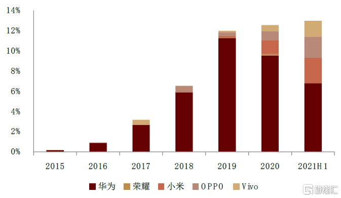 根據IDC數據顯示,國產安卓品牌市場份額近年來不斷提升,以小米、OPPO、Vivo爲例,三家出貨量市場份額由2019年的26%增長至2021年上半年的36%。華爲出貨量銳減,跌出全球前五,而小米出貨量增長迅猛,目前已佔到15%的市場份額。我們看好國產CIS廠商憑藉更緊密的合作在國產替代背景下享受國產品牌出貨增長紅利。