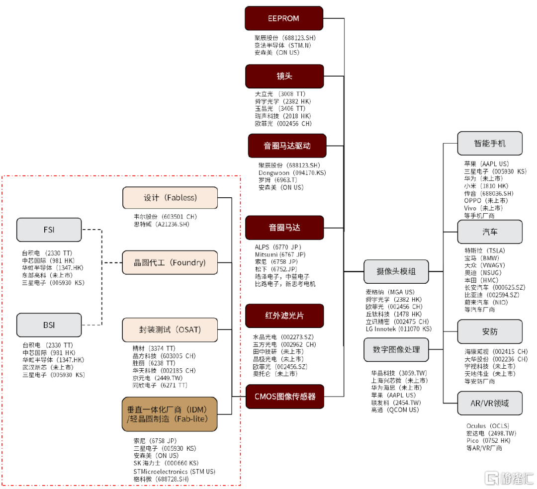 產業鏈:下遊主要爲相機模組廠商,主要廠商採用IDM模式