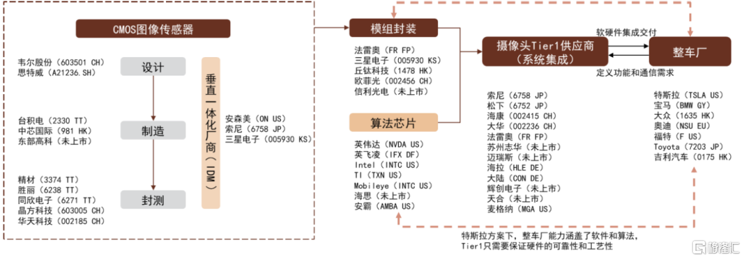 產業鏈方面:汽車供應鏈相對於手機更復雜,在經過設計、代工和封裝測試環節後,由模組廠採購組裝形成攝像頭模組,然後經由攝像頭Tier1供應商完成系統集成後交付給整車廠。CIS廠商還可以通過與算力廠商合作,提前佈局進入整車方案。我們看到以國內“造車新勢力”爲代表的新能源車企也開始走向臺前,開始更多地和CIS廠商形成直接合作。