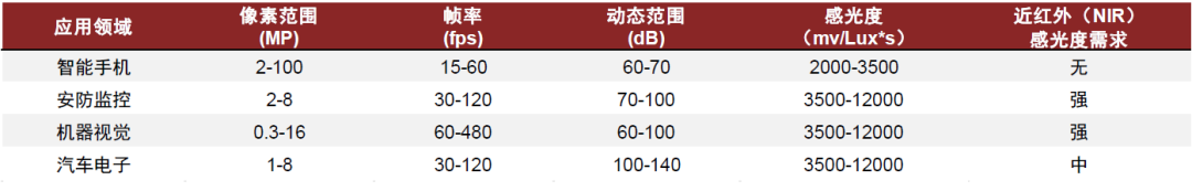 安防CIS對幀率、動態範圍、感光度等性能參數的要求較高。安防攝像機需要在可見光不足、暴曬高溫及其他各類的苛刻環境條件下保持長時間正常工作,且需要具備清晰拍攝高速移動物體的能力,故安防CIS需要有較高的幀率、動態範圍、感光度,且需要配備全局快門技術。我們認爲安防技術和汽車技術存在一定相似性,因此安防領域廠商更有機會切入汽車市場。