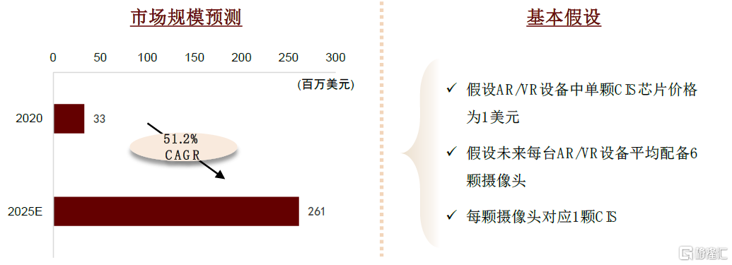 價格下沉和感知需求提升,單機CIS數量或將提升至6-10個。1)設備價格進一步下探,如消費級產品NOLO Sonic發售價1,999元人民幣,有望進一步擴展VR市場空間。2)隨着感知人和感知環境兩個方面性能要求的提升,攝像頭顆數有望達到6-10個,對應CIS單機用量提升至6-10個。根據我們測算,審慎預計,假設AR/VR設備中單顆CIS芯片價格爲1美元,未來每臺AR/VR設備平均配備6顆攝像頭(對應6顆CIS),2025年市場規模爲2.61億美元,未來五年CAGR有望達51.2%。