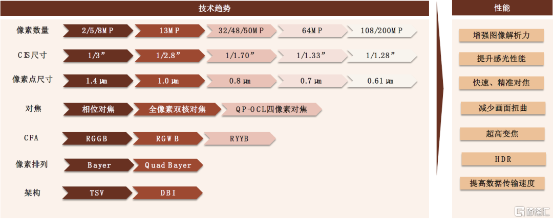從“質”來看,大像面、高像素仍爲提升拍照性能的主要因素。1)大像面:由於同等條件下CIS像素層面積越大,成像質量越好,因此大像面逐漸成爲旗艦機型追求的方向。近年來華爲、蘋果等廠商紛紛向索尼定製大尺寸CIS以提升手機攝像頭的感光性能,推動CIS由1/3”等中尺寸向1/1.3”大尺寸發展,三星、OPPO、Vivo等廠商也紛紛跟進大像面策略。2)高像素:目前主流旗艦機型主攝像素爲48/64MP,1億/2億像素經過迭代之後隨着性能改善開始佔領一部分市場。我們認爲一億以上像素的技術壁壘在於小像素點技術、多合一像素技術、demosaic算法等,短期來看我們認爲擅長小像素點技術的三星、豪威有望引領一億像素以上市場。