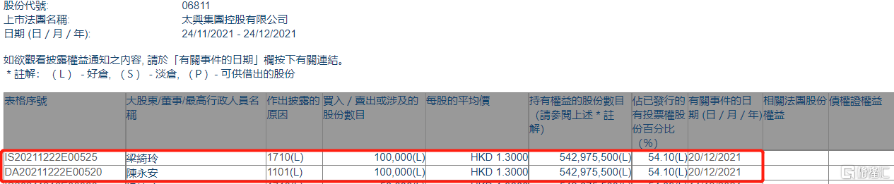 格隆匯APP獲悉,根據聯交所最新權益披露資料顯示,2021年12月20日,太興集團(06811.HK)獲執行董事兼主席陳永安在場內以每股均價1.30港元增持10萬股,涉資約13萬港元。