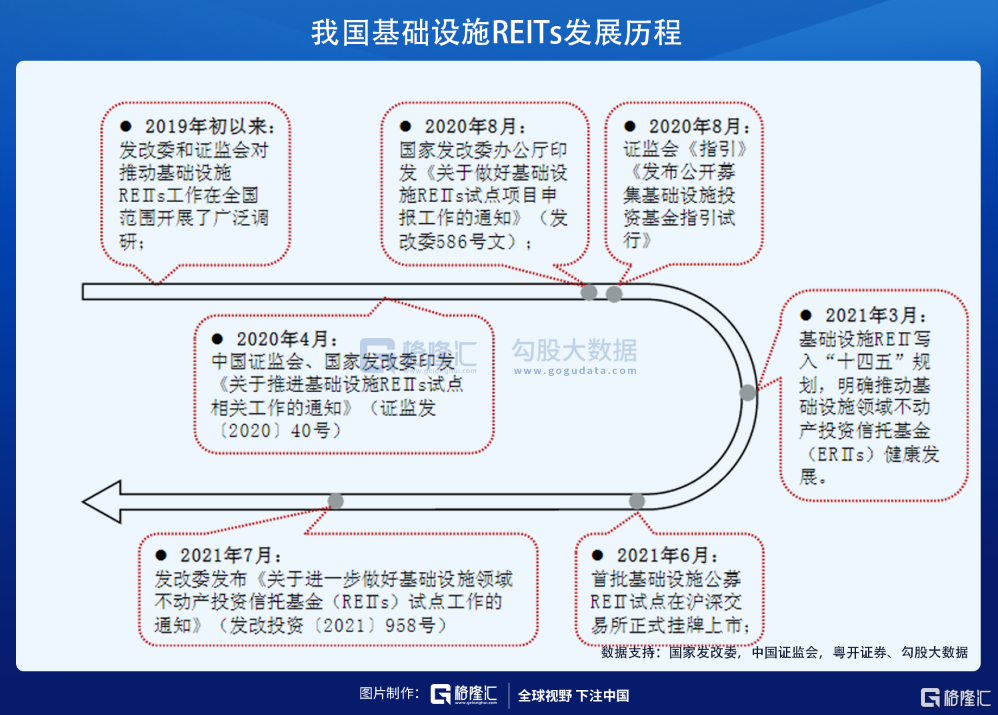 2020年4月30日,由證監會聯合國家發改革委印發《關於推進基礎設施領域不動產投資信託基金(REITs)試點相關工作的通知》,標誌着我國的基礎設施公募REITs市場正式進入序章。此後,REITs進入快速發展階段,首批9支公募REITs於2021年6月掛牌上市,公衆投資者可以通過基金銷售機構以詢價確定的認購價格參與REITs份額認購。