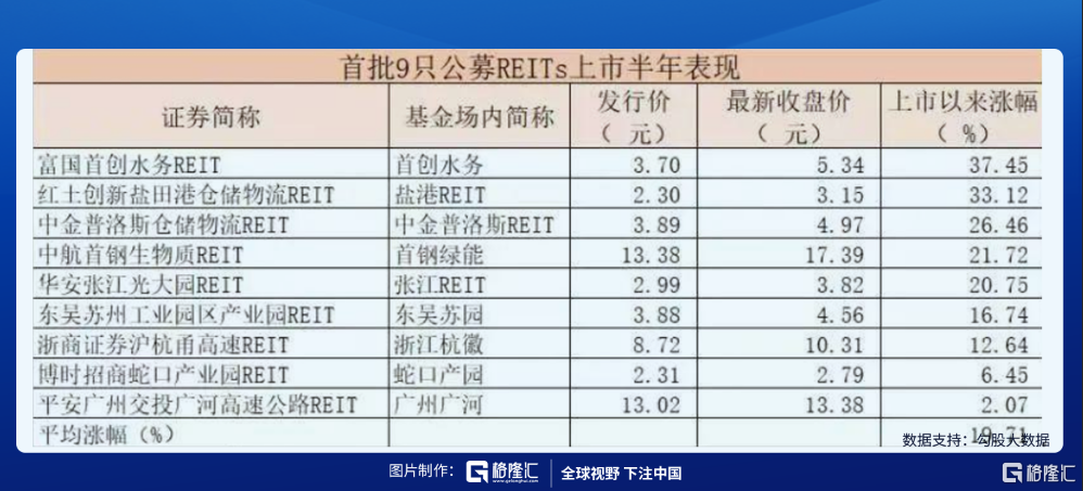 根據統計,截止到21日,市場上首批九隻基礎設施公募REITs試點產品上市已滿半年,平均漲幅達19.71%。此外,第二批兩隻公募REITs已分別於12月14日和12月17日上市。