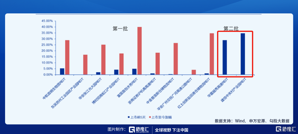 第二批兩隻基礎設施REITs成立於12月3日。由於網上及網下均認購火爆,第二批 REITs 相較於第一批 REITs 中籤率下降較多。華夏越秀高速REIT 網上中籤率爲 2.14%,網下中籤率爲 2.60%;建信中關村 REIT 網上中籤率爲 1.97%,網下中籤率爲 1.83%。華夏越秀高速REIT和建信中關村產業園REIT分別上市於2021年12月的14日和17日。兩者在上市初期漲幅驚人。按收盤價計算,華夏越秀高速REIT上市首日漲幅爲22.76%。建信中關村REIT上市首日則出現“一字板”,漲幅爲30%。