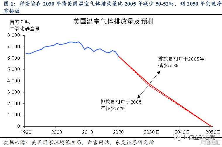 回顧拜登就職以來在氣候變化方面的承諾,主要有三點:①2030年將溫室氣體排放量比2005年減少50-52%,到2050年實現淨零排放(圖1)。②到2035年實現100%零碳電力行業。③與全球100餘個政府共同的甲烷排放承諾:到2030年全球甲烷排放量比2020年減少30%。
