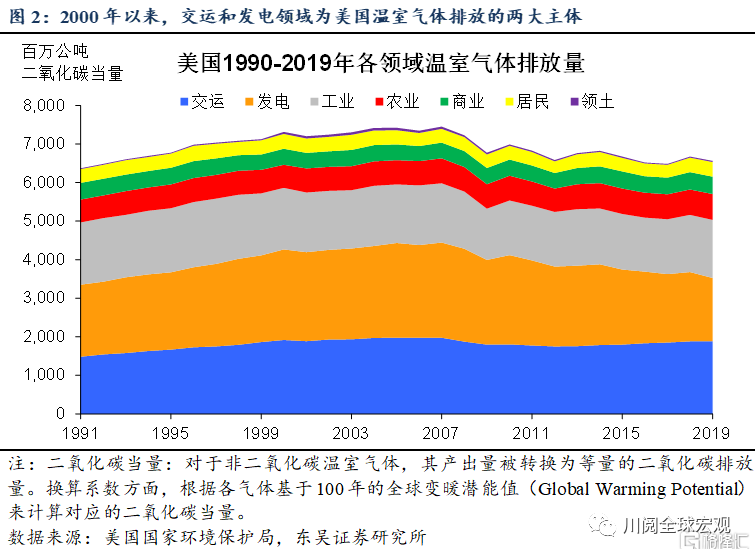 BBB包括了美國在清潔能源方面最大的單項投資5,550億美元,涉及建築、交通、工業、電力等領域(表1)。通過投資、稅收激勵及其他政策,促進可再生能源領域的就業和技術,以及對新能源汽車和公共交通的重大投資,以減少能源和交運美國溫室氣體的兩大主體的溫室氣體排放量(圖2)。