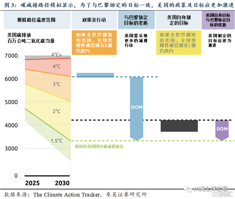 而獨立機構The Climate Action Tracker的分析顯示,爲了與巴黎協定的目標一致,美國的政策及目標應更加激進。從2021年的進程來看,即使全世界都效仿美國,也僅僅將全球變暖控制在2攝氏度內,而非巴黎協定的最優目標1.5攝氏度(圖3)。