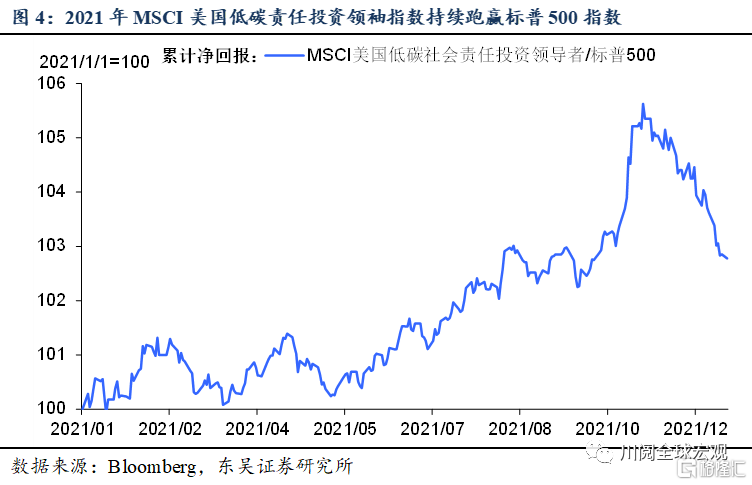 美股方面,在低碳導向的政策利好下,2021年MSCI美國低碳責任投資領袖指數持續跑贏標普500指數(圖4)。MSCI美國低碳指數的編制基於MSCI美國指數,包括了美國市場的大中型股票,該指數選取了碳暴露程度低於大盤、且在環境、社會和治理(ESG)方面表現良好的公司。展望2022年,在BBB計劃有望落地、政策利好的持續下,MSCI美國低碳責任投資領袖指數的超額收益有望持續。