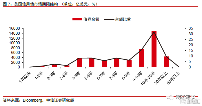 與我國信用債市場期限分佈以短期爲主不同,美國公司債期限分佈整體較爲平均,中長期債券佔比最高。其中10-30年的佔比最高,規模在1.39萬億規模,佔比超過31%,具體來看,1年以內的存量信用債爲佔比不到0.08%;1-3年的佔比3.7%;3-5年佔比接近10%;7-10年期限的存量債佔比14%;10-30年期限規模和佔比最高;不同於國內信用債市場,美國30年期限以上的佔比9.48%,甚至50年以上的佔比也有0.33%。