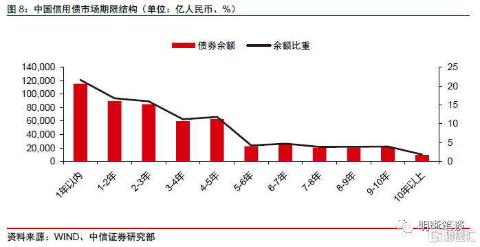 從存量債券市場全部債券的期限分佈來看,目前中短期佔比較大。存量債券市場期限分佈來看,期限爲1年以內的債券佔比22%,1-3年的佔比超過50%,而10年以上期限債券佔比僅不到2%。中短期債券仍佔存量債券市場的大部分。