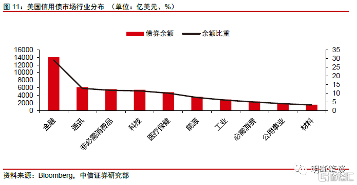 美國信用債行業分佈在金融、通訊、科技、能源和消費等領域