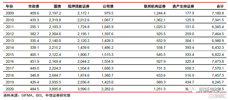 按照大類來分,美國固收市場主要交易品種包含國債、市政債、聯邦機構債、貨幣市場工具、MBS、ABS、公司債等。據美國證券業與金融市場協會(SIFMA)披露,2020年美國債券發行額達到12.2萬億美元,比上年增長48.1%。抵押貸款支持證券發行量增長96.2%至4.0萬億美元,其次是公司債券增長60.4%至2.3萬億美元和美國國債增長32.7%至3.9萬億美元。美國市政債券發行量增加13.6%至4845億美元,聯邦機構證券增長26.5%至1.3萬億美元。資產支持證券發行下降30.0%至3043億美元。