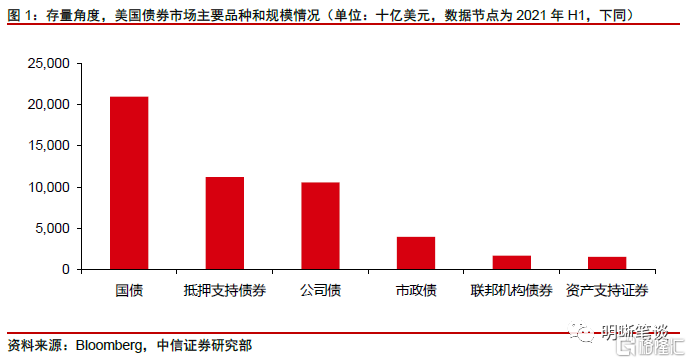 截至2021年H1,美國債券市場存量規模超過47萬億美元。其中主要包括國債20.97萬億美元,抵押貸款相關證券11.21萬億美元,公司債10.56萬億美元,市政債3.95萬億美元,聯邦機構債1.69萬億美元,ABS 1.54萬億美元。