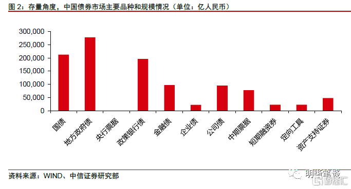 我國債券市場主要分爲利率債和信用債兩類。其中,利率債是指揹負國家或政府信用的債券品種,主要爲國債、地方政府債、央票、政策性銀行債,其餘均爲信用類債券,如金融債、企業債、公司債、中短融等。