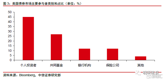 美國固收市場的參與者主要包括美聯儲、政府類基金、存款機構、經紀人和交易商、投資基金、養老基金、退休基金、保險公司、海外和國際投資者、個人等。美國固收持有結構整體可以分爲兩類:聯儲及政府賬戶和私人部門。其中,聯儲及政府賬戶包括美聯儲和政府持有,政府持有包括政府信託基金、轉向基金等持有的政府賬戶系列證券,以及聯邦融資銀行證券;私人部門包括存款類機構、養老保險基金、共同基金、海外和國際投資者以及其他。