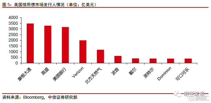 美國信用債中,進一步細分來看金融行業發行規模4180億美元,同比增長32.5%;金融機構當中,發行人主要包括美國銀行、摩根大通、高盛、花旗集團等;非金融行業發行規模1.86萬億美元,同比68.0%。而非銀金融行業發行人則包羅萬象,排名靠前的主要是蘋果公司、Verizon通信股份有限公司、NBC環球傳媒有限責任公司、通用電氣等企業。