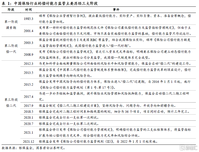 中國保險行業的償付能力監管主要歷經三大階段,分別爲:保險行業起步初期對償付能力監管的摸索階段、借鑑歐美償付能力監管經驗的“償一代”時期,以及基於我國保險業發展實際建立的更爲科學全面評估風險的“償二代”時期。